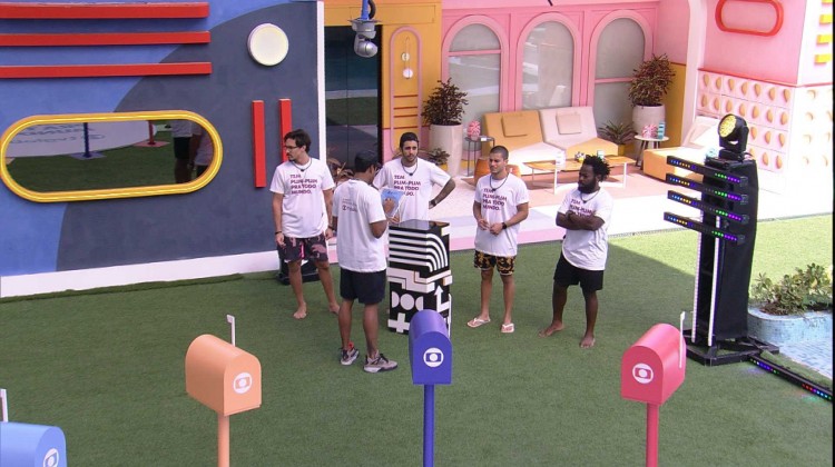 Após conversarem com Boninho, que apareceu no telão da sala da casa do BBB 22, os brothers do TOP 5 vão para a área externa da casa para participar de uma dinâmica especial.